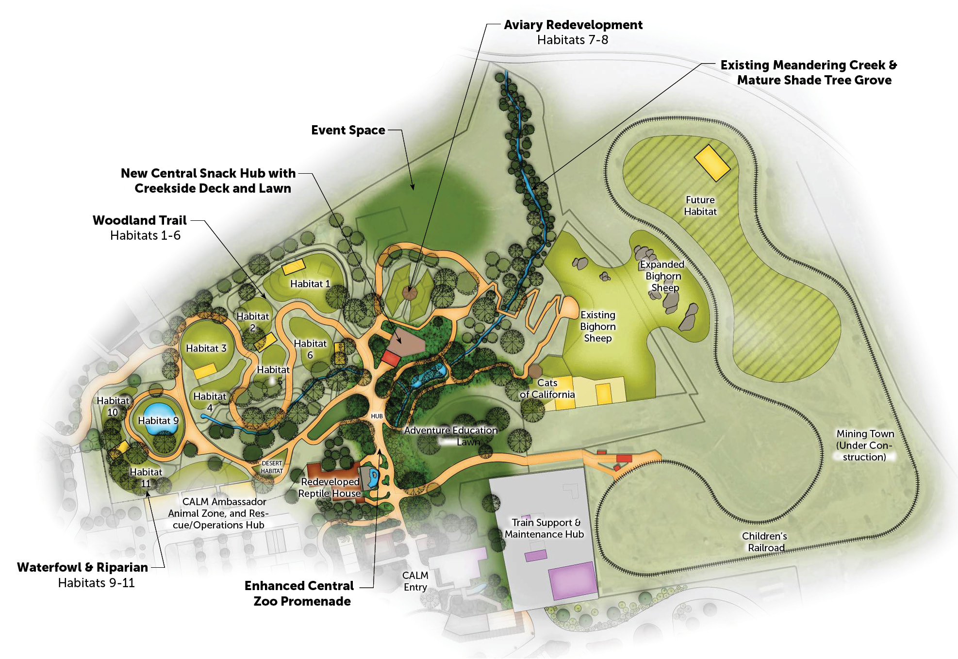 A new visitor central hub with snack station and seating deck, overlooking central stream and ravine, as well as new habitats.